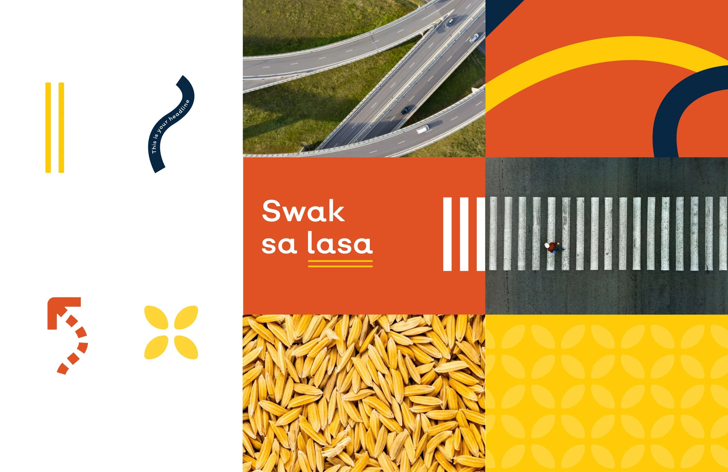 We built a flexible visual system from two things: rice and roads. Curved lines inspired by paths and steam add motion and direction. Repetitive grain shapes symbolize abundance—used subtly as patterns, borders, and textures.